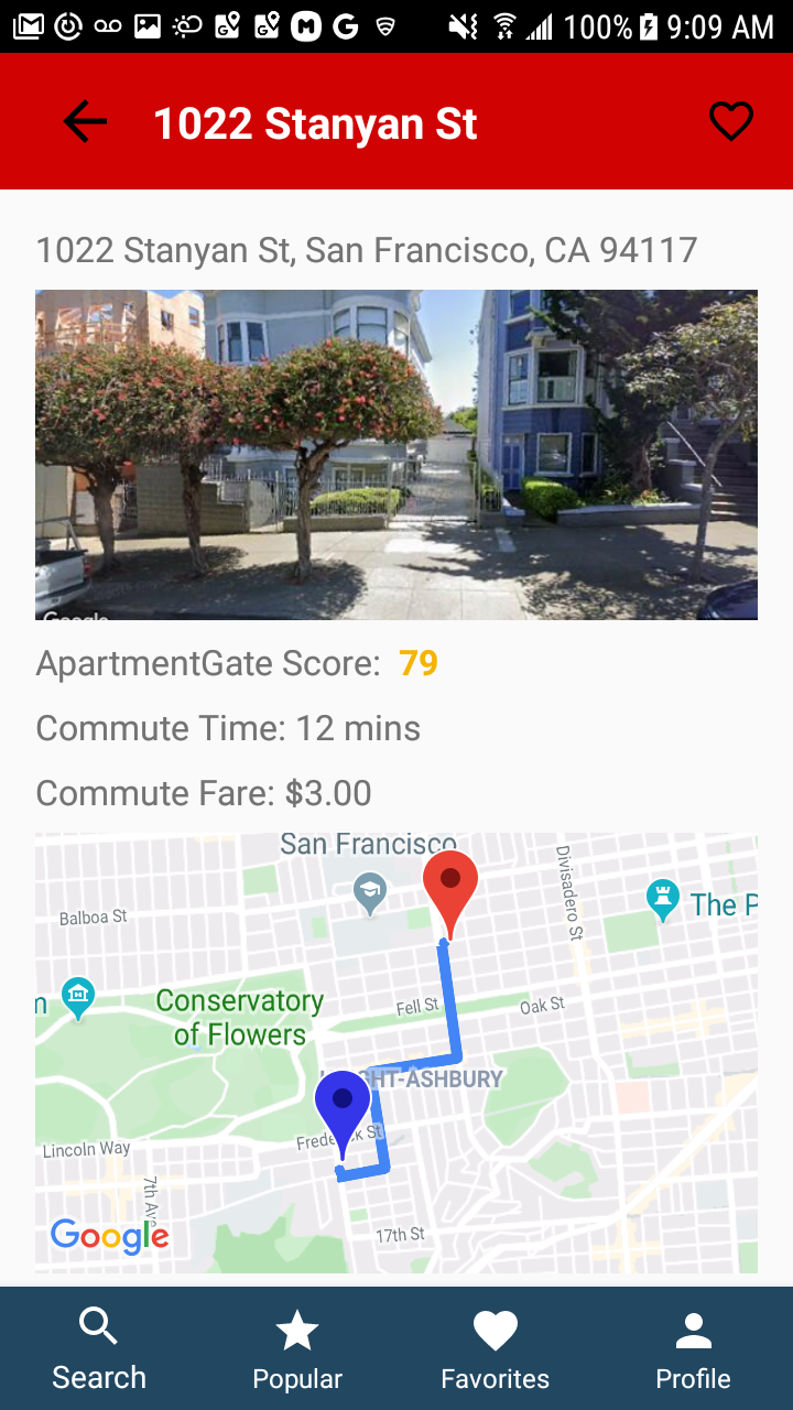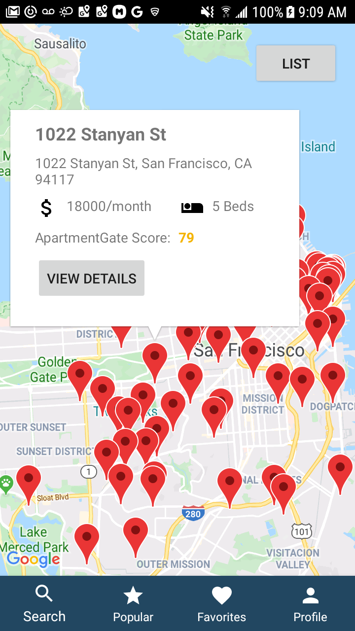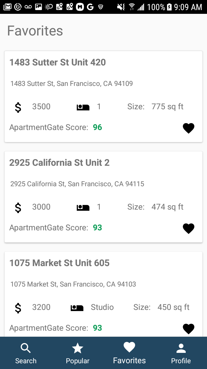 ApartmentGate is an Android App for browsing apartment listings in San Francisco. The app takes information about the user's work address, work hours, perferred method of commute, ideal budget, apartment size and preferred neighborhood atmosphere to grade apartment listings based on how closely they fit the user's criteria. The app also aggregates information from all users to determine the most popular neighborhoods.