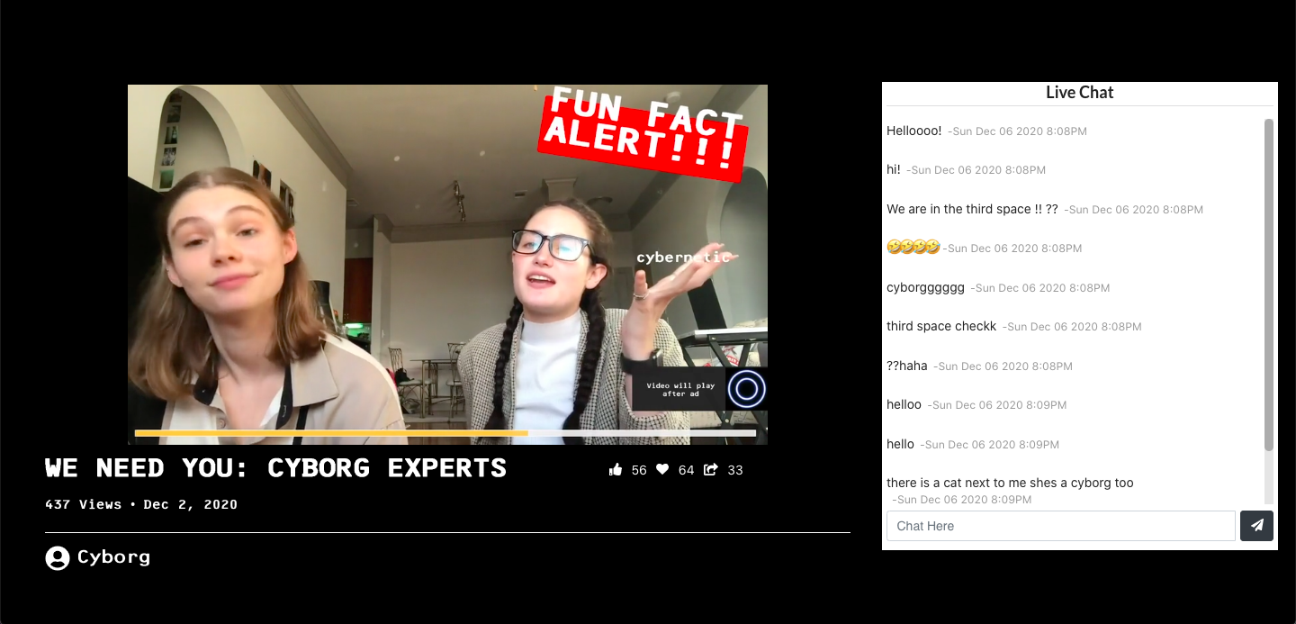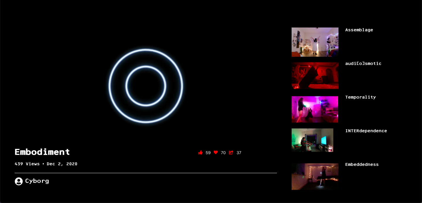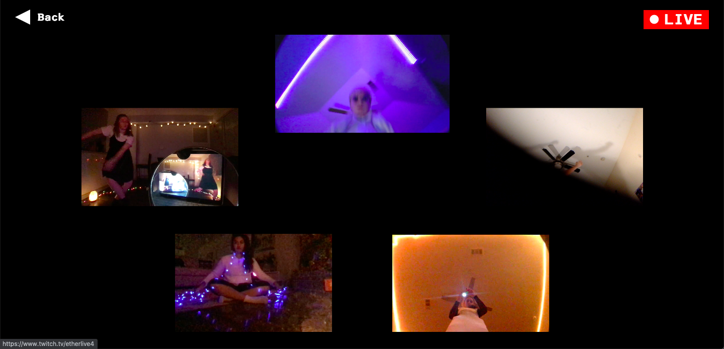 In The Ether is a Web App that delivered a theatrical performance from the UT Theatre and Dance Department in an interactive, virtual format. Audience members were able to view live performances via embeded Twitch streams, interact with a chat, view a parallax scrolling gallery of past performances, and navigate between different dancers with a YouTube themed UI.